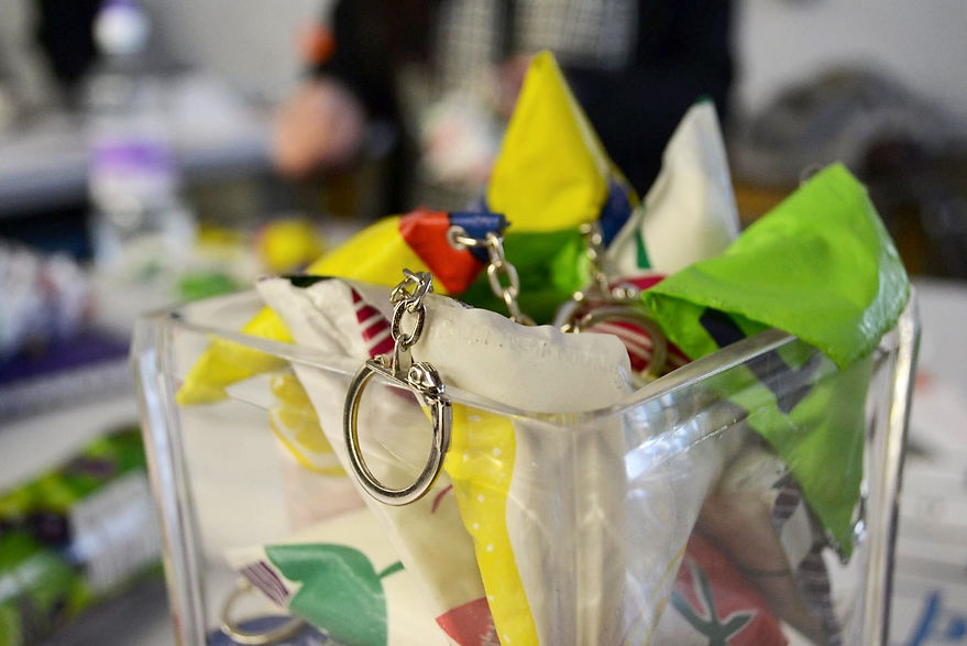 Creating keyrings that held space to store a single use plastic bag was one of our solutions, which we handed out at our exhibition.